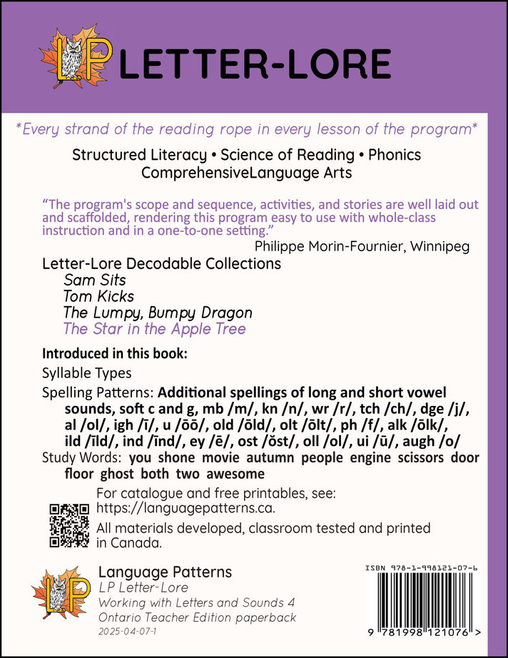 Working with Letters and Sounds 4 (WLS 4): Ontario Teacher Edition. This edition directly links each page of the student workbook to the relevant requirements of the 2023 Ontario Language Curriculum. This edition also contains lesson plans and teaching tips to teach the key elements of Science of Reading instruction, including: